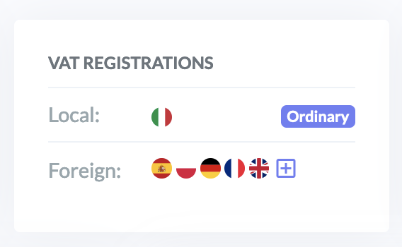 The first line shows the tax registration of the country where the seller is established and its tax regime. While the second line summarizes the active VAT registrations in foreign countries.