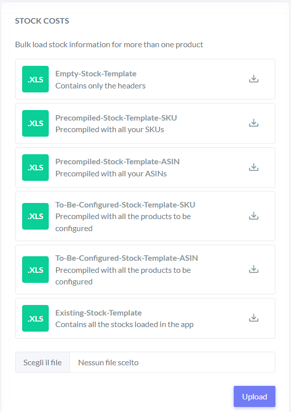* **Existing stock Template**: in addition to the headers, this template already contains all the stocks previously uploaded.
