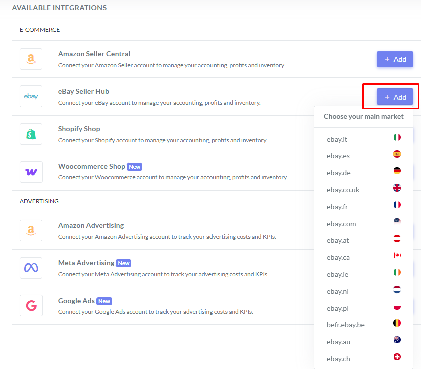 Click the “**Add**” button in the eBay integration and select your main marketplace from the drop-down menu.