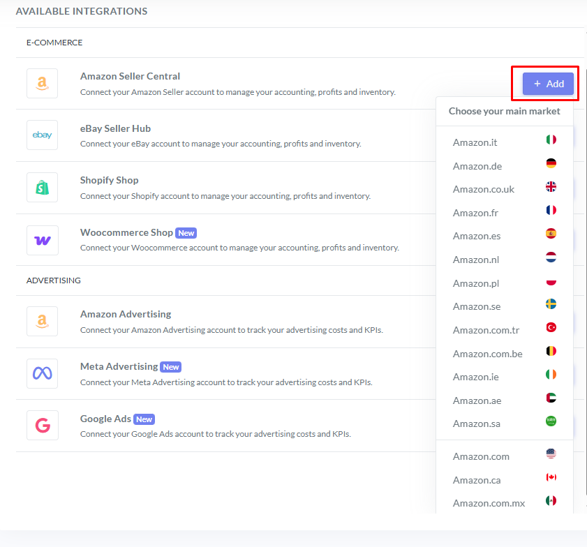 Click "**Add**" for the Amazon Seller Central integration and select your primary marketplace from the drop-down menu.